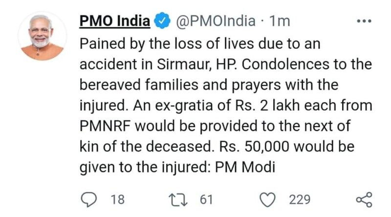 पर प्रधानमंत्री की तरफ से शोक संदेश जारी किया है। जारी संदेश मे कहा गया है कि “हिमाचल प्रदेश के सिरमौर में हुए हादसे में लोगों की मौत से आहत हूँ। शोक संतप्त परिवारों के प्रति संवेदना और घायलों के साथ प्रार्थना। पीएमएनआरएफ की ओर से दो-दो लाख मृतक के परिजनों को दिए जाएंगे। घायलों को 50,000 रुपये दिए जाएंगे: पीएम मोदी”